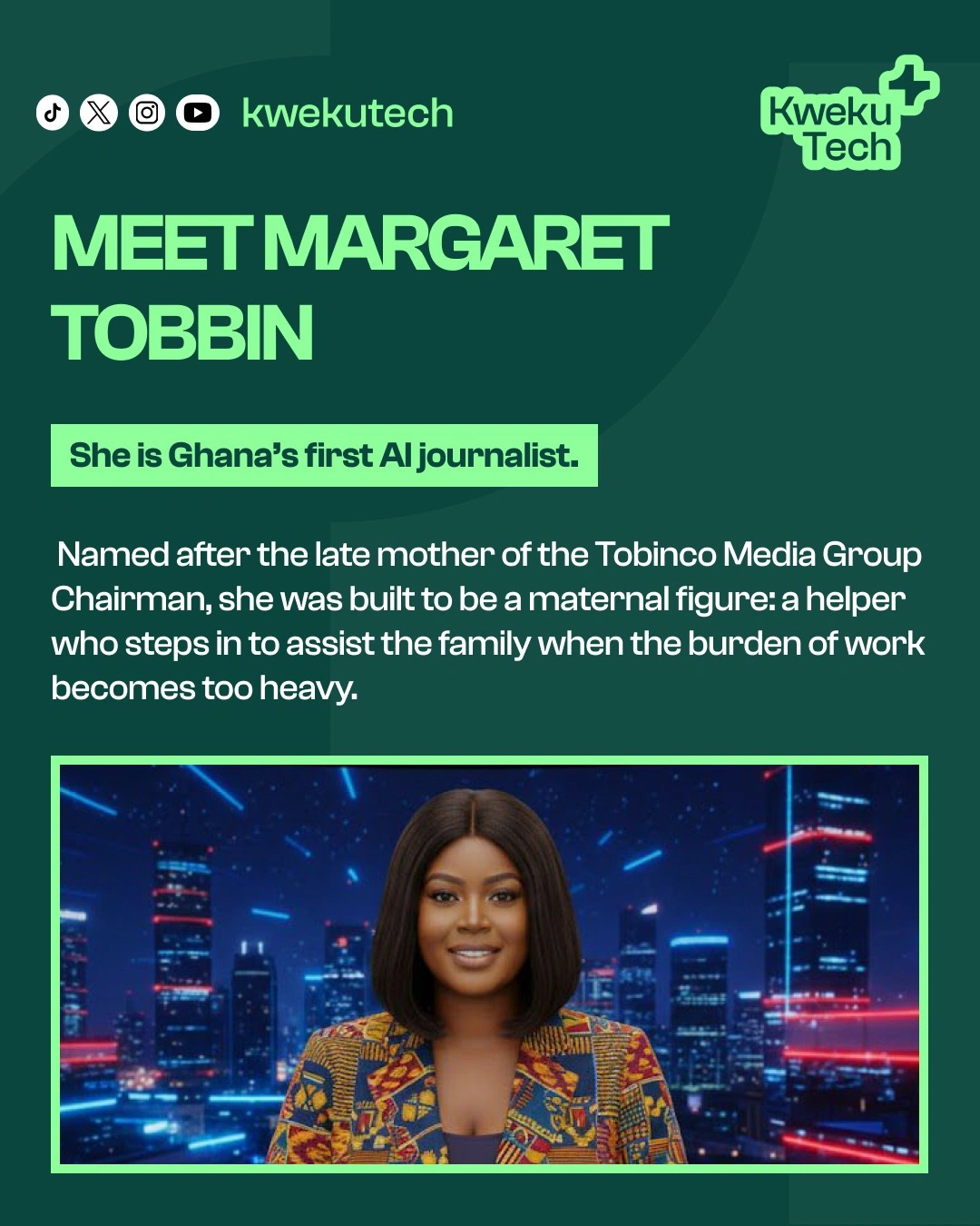The arrival of Margaret Tobbin, Ghana’s first AI journalist, represents a significant milestone in the African media landscape. Introduced by the Tobinco Media Group, Margaret is more than just a technological feat; she is a tribute. Named after the late mother of the group’s Executive Chairman, her presence is built on the concept of a maternal figure stepping in to help the family when the burden becomes too heavy.